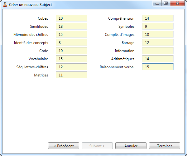 - Calcul des indices CHC : Gf (Intelligence fluide), Gc (Intelligence cristallisé), Gv (Visuo-spatial), Gsm (Mémoire de travail), Gs (Rapidité de traitement) (v)