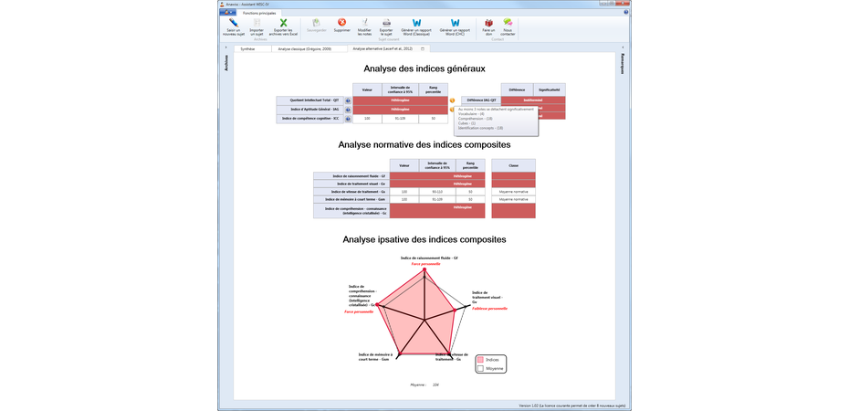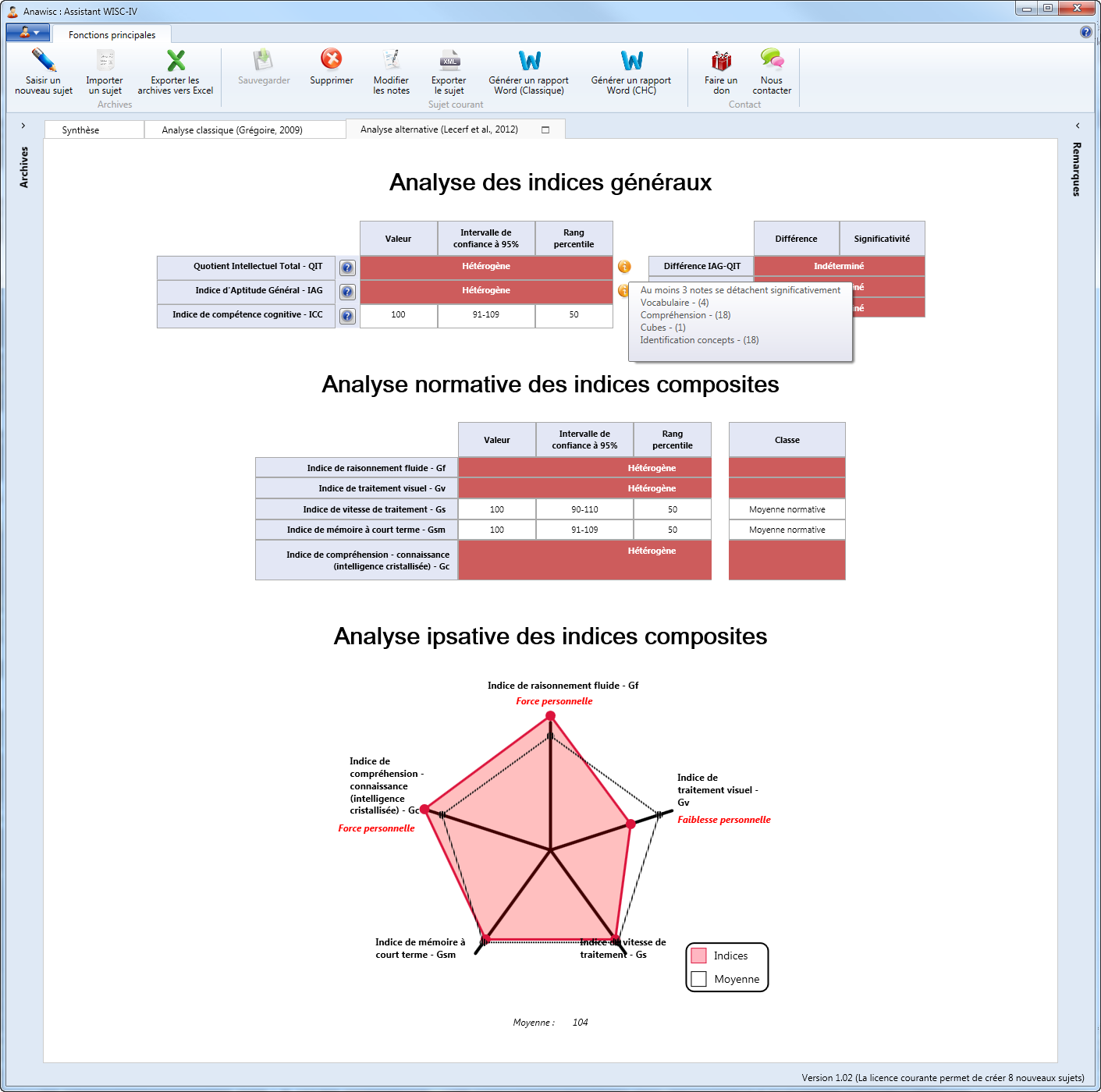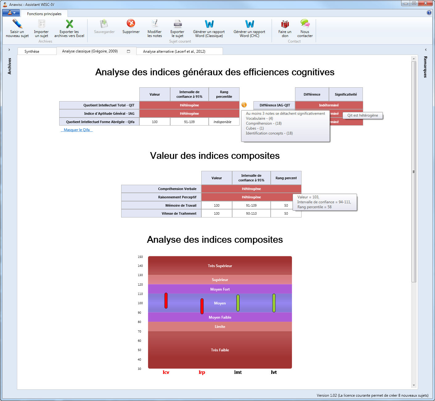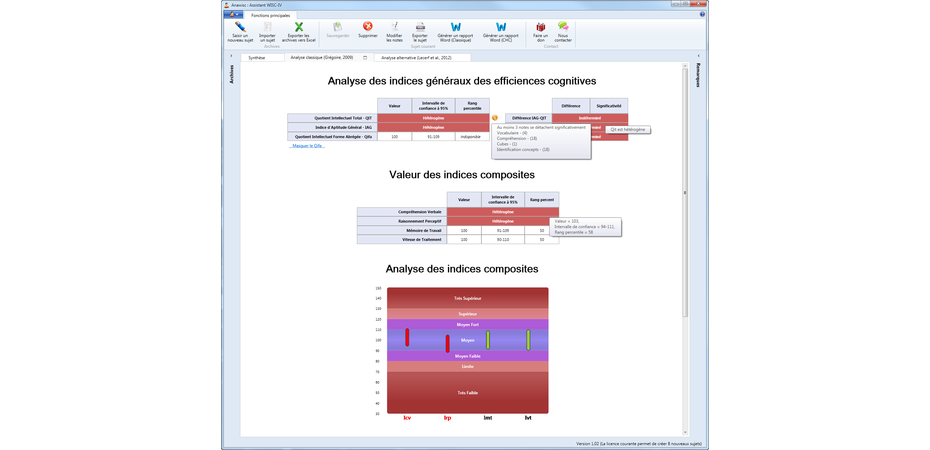 - Calcul du QIT, IAG (Indice d'Aptitude Générale), ICC (Indice de Compétence Cognitive) et (en option) du Qifa